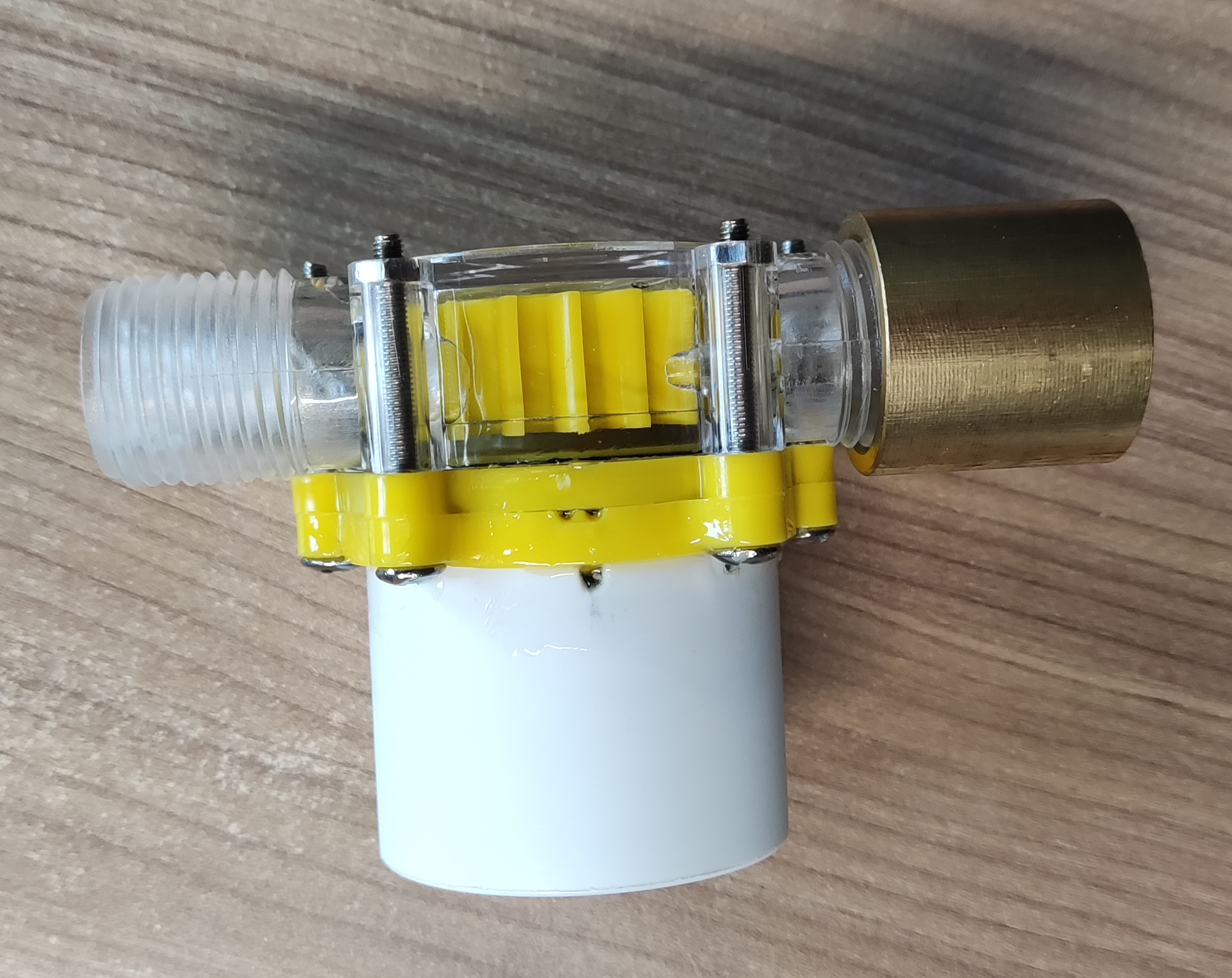 On testing it seemed that with only a modest water flow it could get to 12v; taking it apart later determined that there was a regulator and capacitor inside that help to regulate the voltage. Current to power a couple of LEds was quite sufficient.